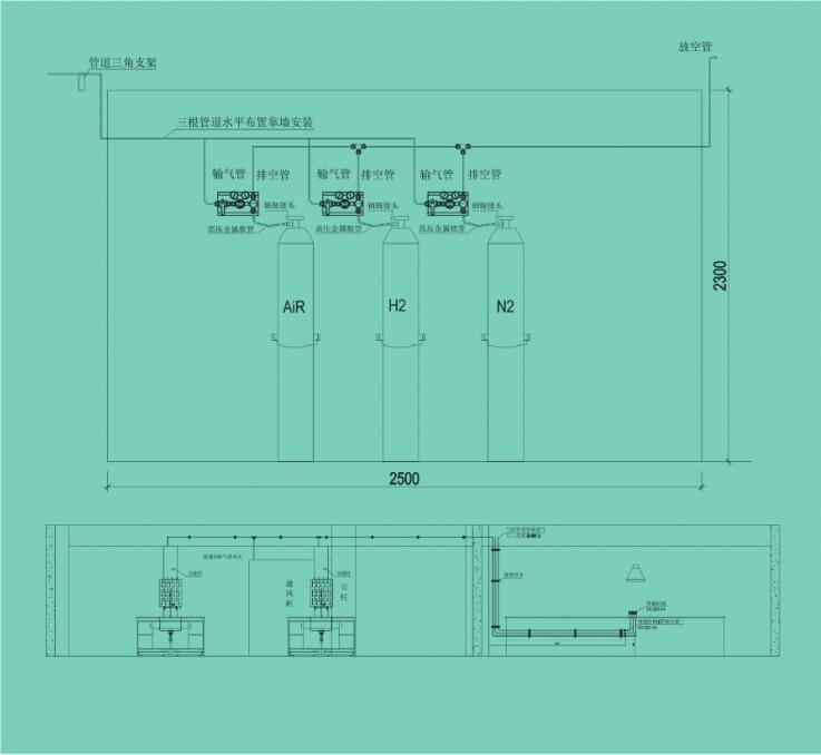 實(shí)驗(yàn)室用氣主要有不燃?xì)怏w(氮?dú)狻⒍趸迹⒍栊詺怏w(氬氣,氦氣等)、易燃?xì)怏w(氫氣、一氧化碳)、劇毒氣體〔氟氣、氯氣)及助燃?xì)怏w(氧氣)組成,可以通過輸氣管接到各實(shí)驗(yàn)室內(nèi),一般氣相室配置氦氣(He)、氮?dú)猓∟2)。氣質(zhì)聯(lián)用室配置氮?dú)猓葰狻⒀鯕狻K泄芫€在安裝完畢后一定要做氣密性實(shí)驗(yàn),嚴(yán)禁有泄露的可能。由于管道細(xì)小,管間距小,安裝過程中可依據(jù)現(xiàn)場情況進(jìn)行凋整,氣瓶裝柜時(shí),易燃易爆與惰性氣體同柜,杜絕兩種易燃?xì)怏w氣瓶同柜。