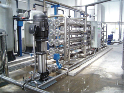 4、原水→多介質過濾器→活性炭過濾器→軟化水器→中間水箱→低壓泵→PH值調節→高效混合器→精密過濾器→高效反滲透→中間水箱→EDI水泵→EDI系統→微孔過濾器→用水點。