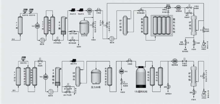 3、采用EDI方式,其流程如下:實驗室超純水系統,超純水設備 原水→原水加壓泵→多介質過濾器→活性炭過濾器→軟水器→精密過濾器→一級反滲透機→中間水箱→中間水泵→EDI系統→微孔過濾器→用水點。