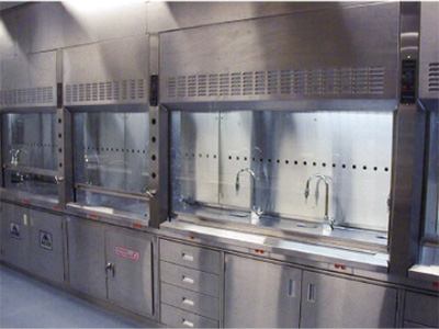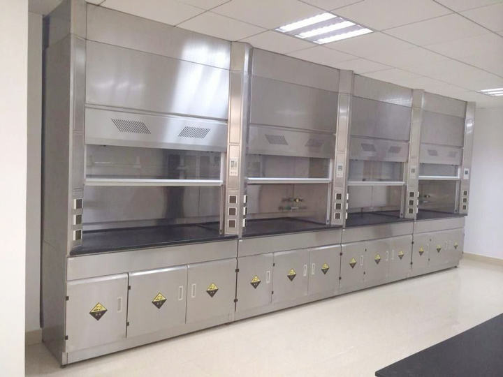(1)內襯板、導流板:采用厚度1.2mm不銹鋼鋼板制作,分層(上、中、下),并使柜內無排風死角,各種比重氣體均能順利排出柜外,三塊導流板使處于不同高度空間有害氣體以控制濃度小于0.5ML/M3的性能指標分別從不同段區排出,操作口表面風速0.3-0.5M/S的速度將通風柜中氣體排出,確無任何殘留氣體存在。排風量1000-1600M3/N,噪聲要小。