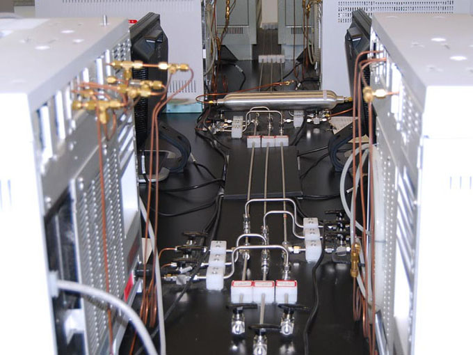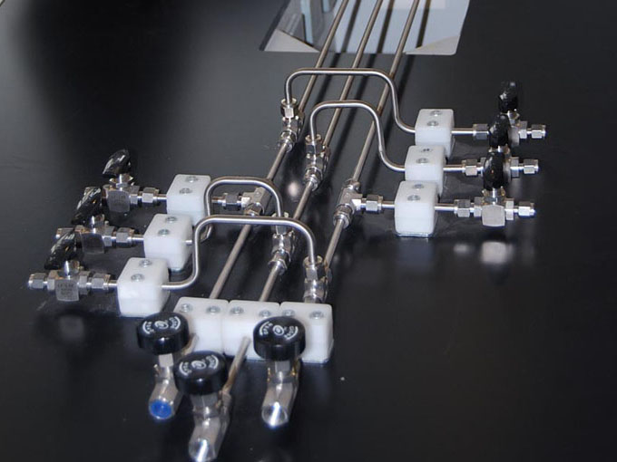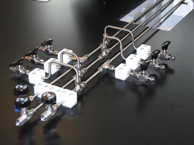 環境檢測實驗室用氣主要有不燃氣體(氮氣、二氧化碳)、惰性氣體(氬氣、氦氣等)、易燃氣體(氫氣、一氧化碳)、助燃氣體(氧氣)組成。除不燃氣體、惰性氣體外其他氣體不進入實驗室,通過輸氣管接到各實驗室內。一般氣相色譜室配置氦氣、氮氣。氣質聯用室配置了氦氣、氫氣、氧氣。氫氣管線上的連接管件都要連接后焊接,嚴禁泄漏。所有的管線在安裝完畢后要做氣密性測試,并在使用前要先除油。由于管道細小,管間距小,安裝過程中可依據現場情況進行調整,保證間距不小于45mm,氣瓶裝瓶時,易燃易爆與惰性氣體同柜,不要兩種易燃氣瓶裝一柜。